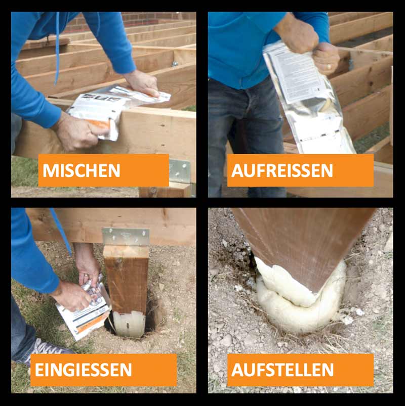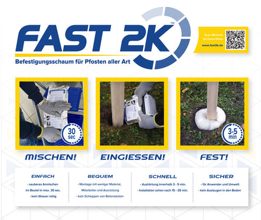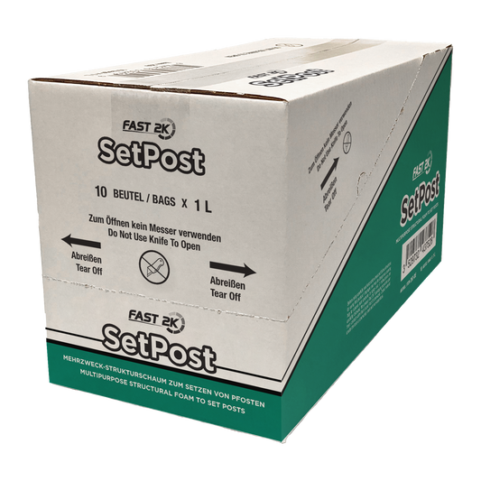 Fast 2K ist die einfache, schnelle, bequeme und sichere Alternative zu Beton zum Setzen von Pfosten aller Art und vieles mehr. Fast 2K ist eine 2-Komponenten – Polymer – Technologie, die nach dem Mischen expandiert und den Raum zwischen Pfosten und Bohrloch ausfüllt.
